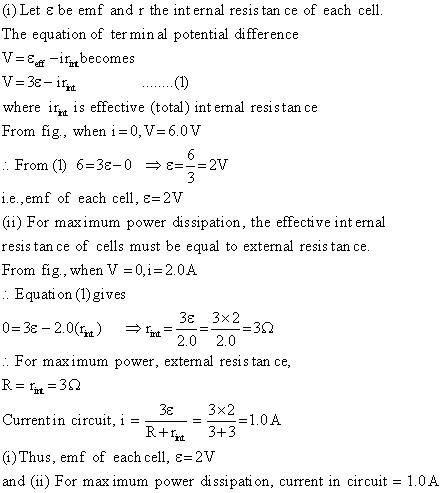 Q48. The following graph shows the variation of terminal potential difference V, across a combination of three cells in series to a resistor, versus current I :