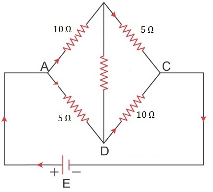 Q10. Figure below shows an unbalanced Wheatstone bridge. What is the direction of conventional current between B and D?