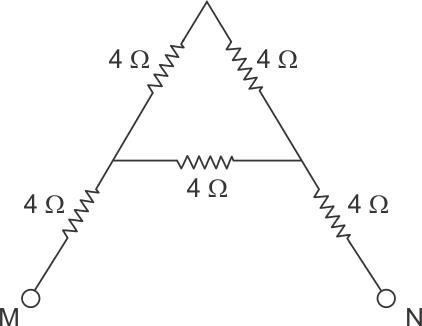 In given circuit two 4 Ω resistances are in series and parallel with the resistance 4 Ω which are connected to the two 4 Ω resistance in series. Hence, resistance across the M and N will be,