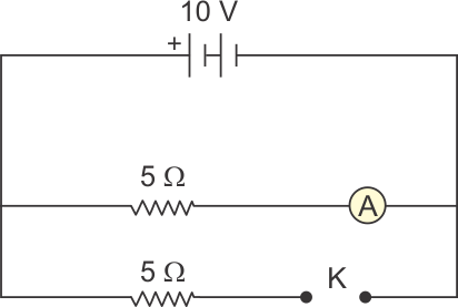 Q34. In the figure, what will be the reading of the ammeter and voltmeter, when the key K is closed? The internal resistance of the cell is zero.
