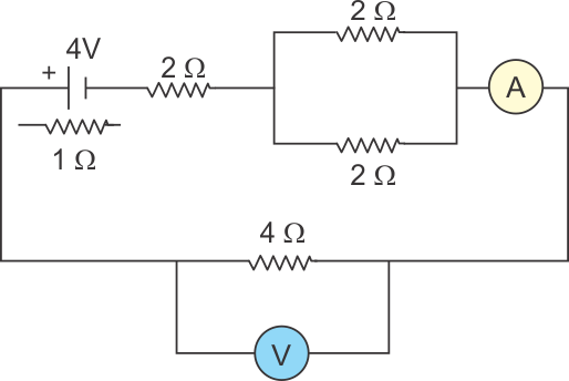 Voltmeter is in parallel with the cell. And total resistance in the circuit is 2.5 Ω.